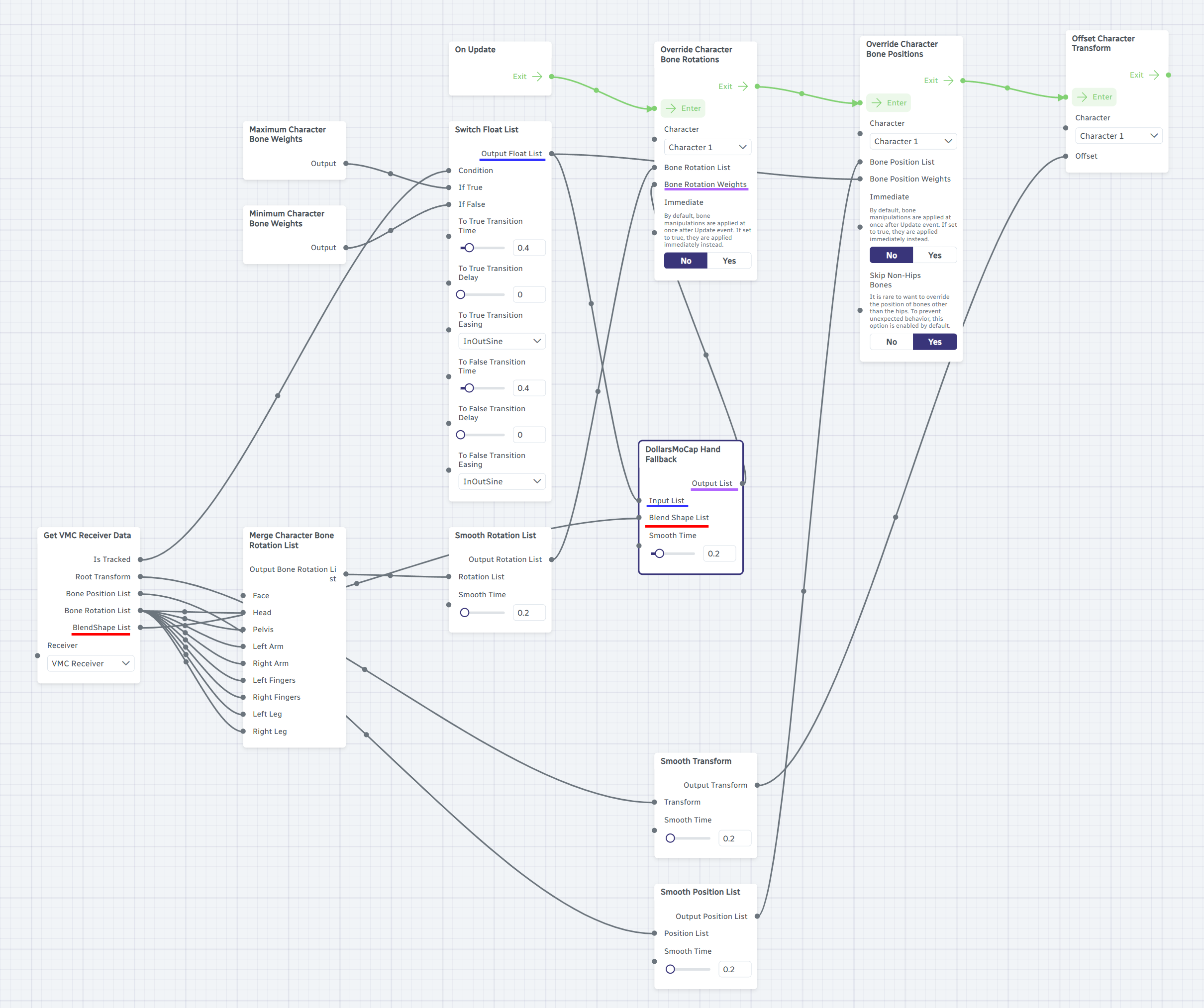 | DollarsMoCap Hand Fallback → Blend Shape List | Get VMC Receiver Data → BlendShape List |
