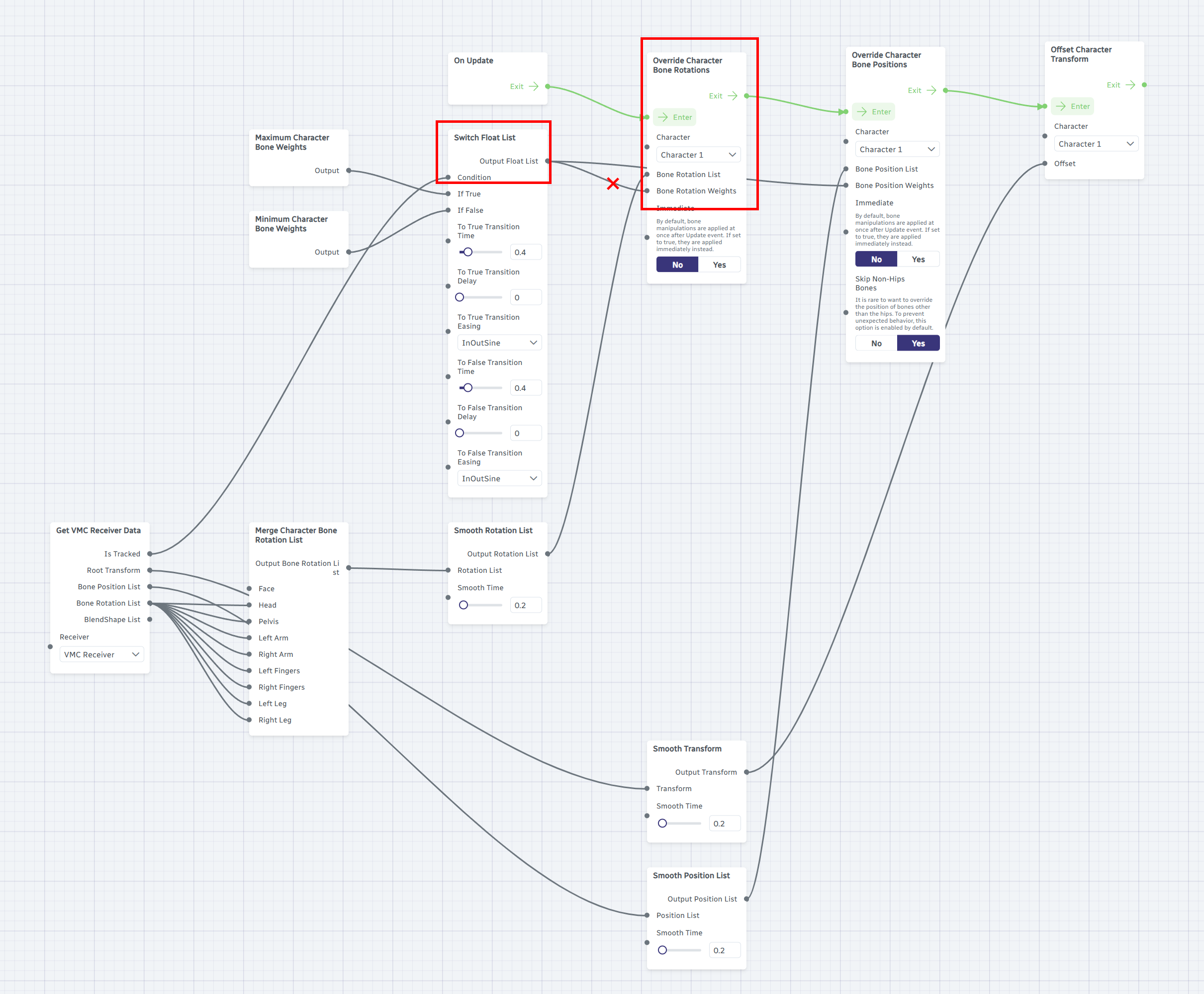 Open the VMC Pose Tracking blueprint in Warudo and locate the Switch Float List and Override Character Bone Rotations nodes.