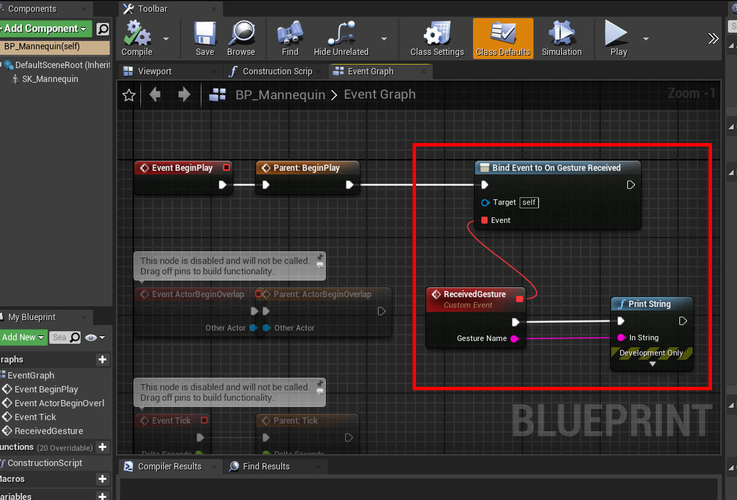 In the character blueprint, you can bind the On Gesture Received message and use the Gesture Name to determine the type of gesture that was triggered.