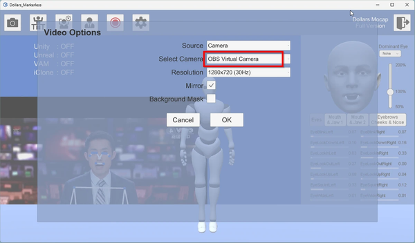- In Dollars MONO, select the OBS virtual camera as the video source.