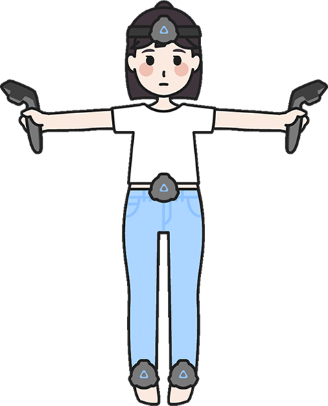 To perform motion capture with Dollars VIVA, in addition to holding HTC VIVE controllers in both hands, you need to wear HTC VIVE Trackers on your forehead, waist, and the top of both feet.