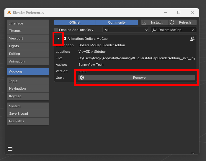 To uninstall the DollarsMoCap addon, click the triangle icon on the left to expand the addon details, then click Remove to uninstall.