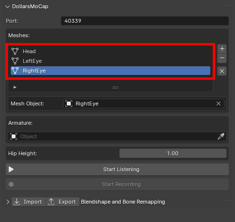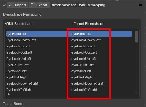 If your model's blendshapes do not use ARKit naming conventions, you can adjust the Target Blendshape names in the Blendshape Remapping panel.