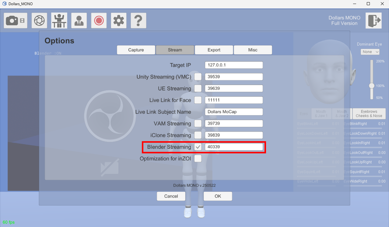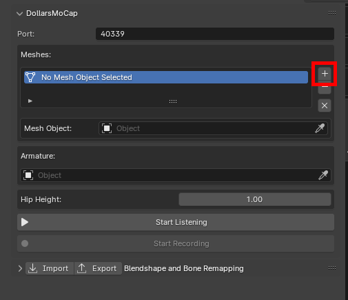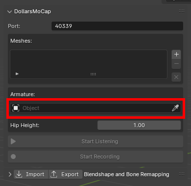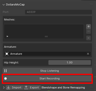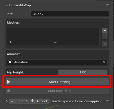 In the DollarsMoCap program, enable the Blender streaming. You can modify the port as needed.
