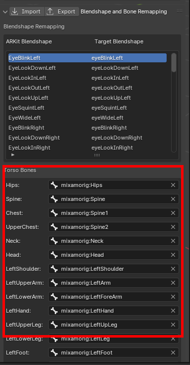 After setting up blendshape or bone mappings, click Export to save the current configuration for future use.