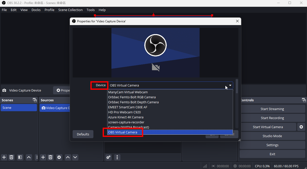 - In the Device list, locate OBS Virtual Camera and note its position in the list.