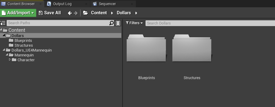 Unzip the downloaded file and copy the Dollars directory and the Control Rig directory (here we use UE4 Mannequin as an example) to the Content directory of your project. Make sure the Dollars directory structure remains unchanged.